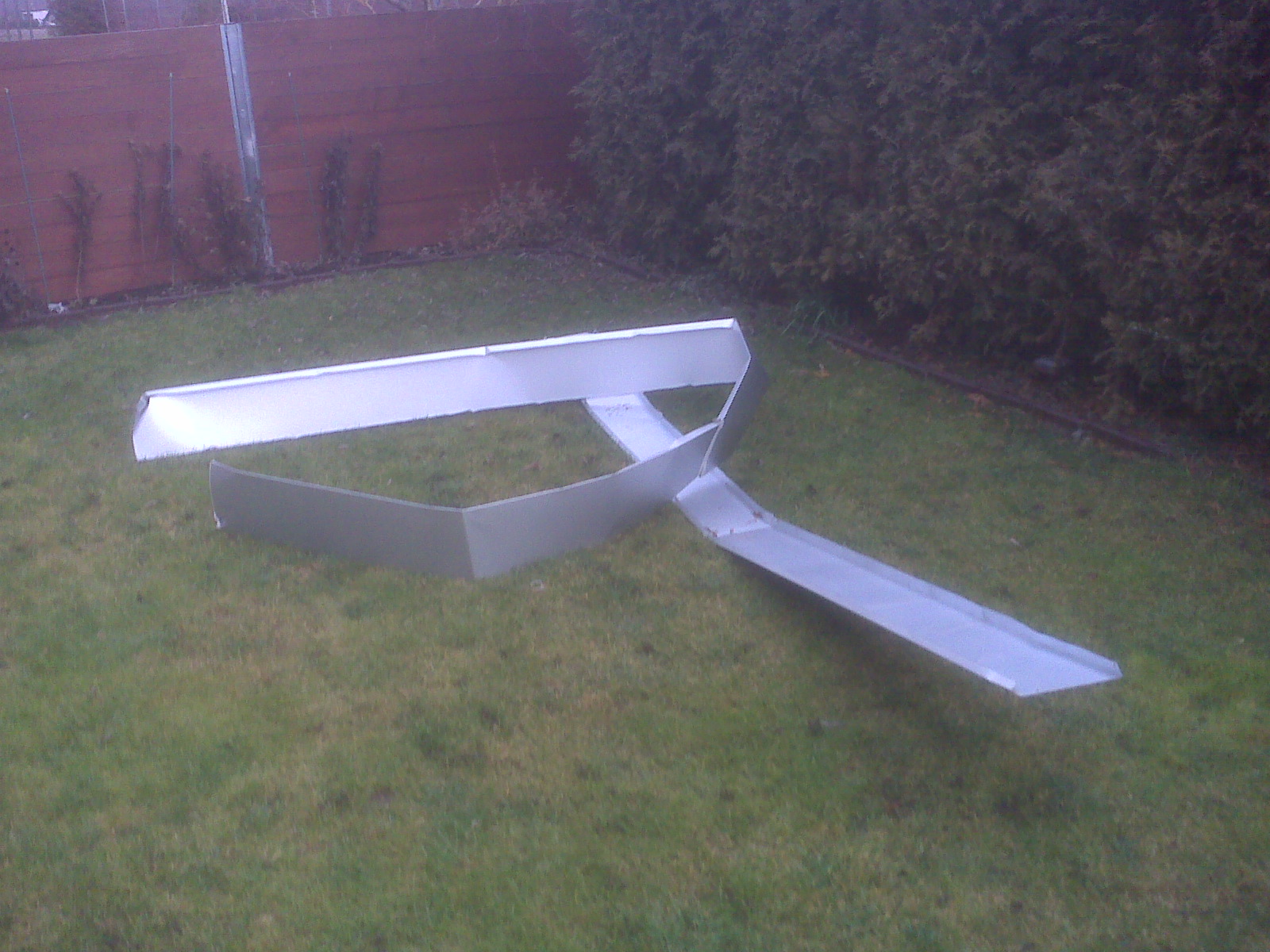 Dnes před půl třetí ráno nám na střechu a zahradu spadlo z nebe něco přes 10 metrů korýtka 20x5 cm z pozinkovaného plechu. Kromě poničené paraboly a antény naštěstí k žádné další škodě nedošlo...