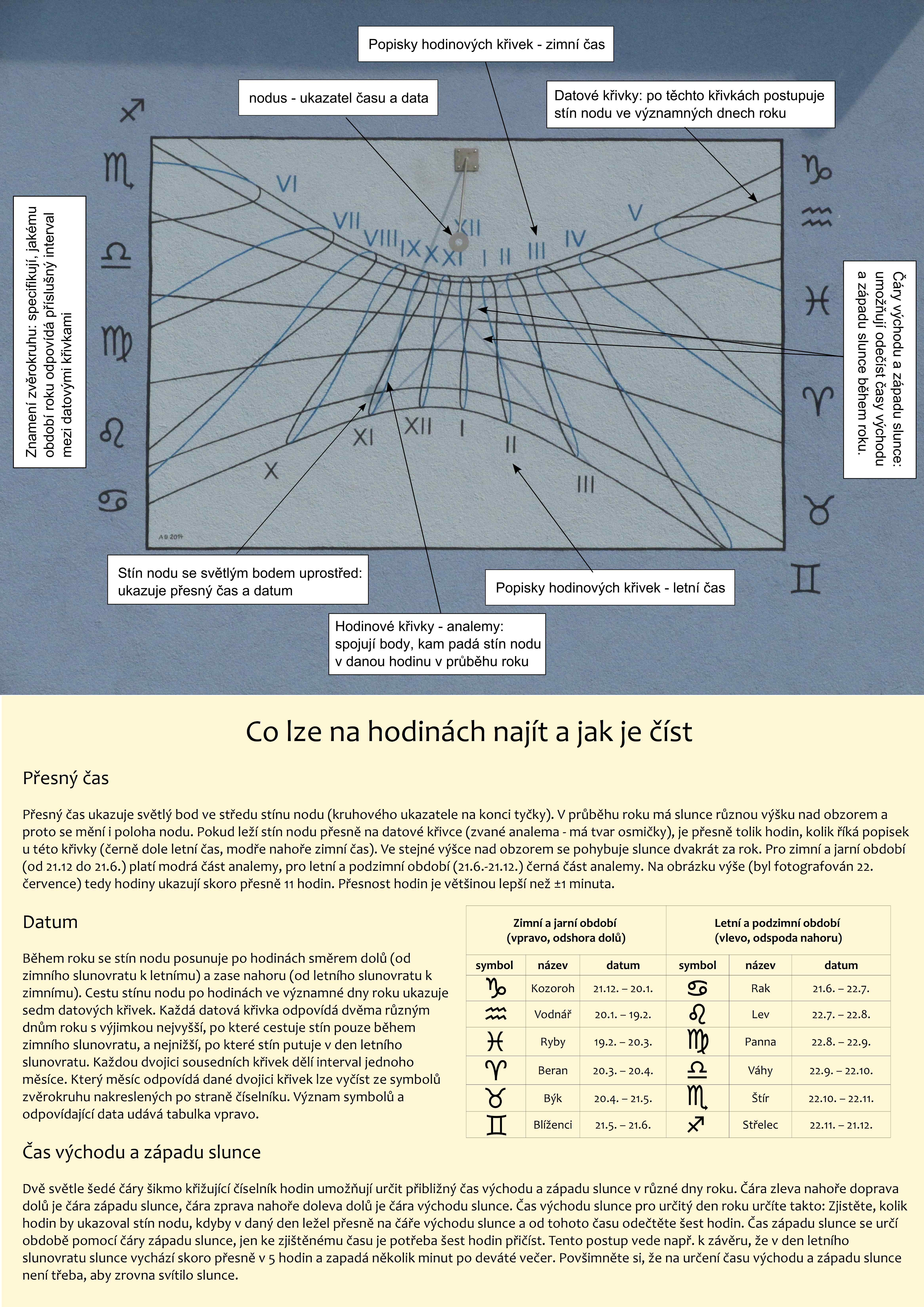 ) domě se letos objevily sluneční hodiny. Těší mě všechny ohlasy, povětšinou veskrze pozitivní. Mnozí (tedy ve skutečnosti vlastně úplně všichni, se kterými jsem o tom mluvil) si ale stěžují, že vlastně nevědí, jak hodiny číst. Při pohledu na tu spleť čar se ani nedivím. Proto jsem k hodinám udělal návod k použití. Časem bych ho chtěl umístit ven, ale než se k tomu dostanu, tak ho pro zájemce dávám alespoň sem. Náhled je níže, obrázek ve vysokém rozlišení ke stažení zde: