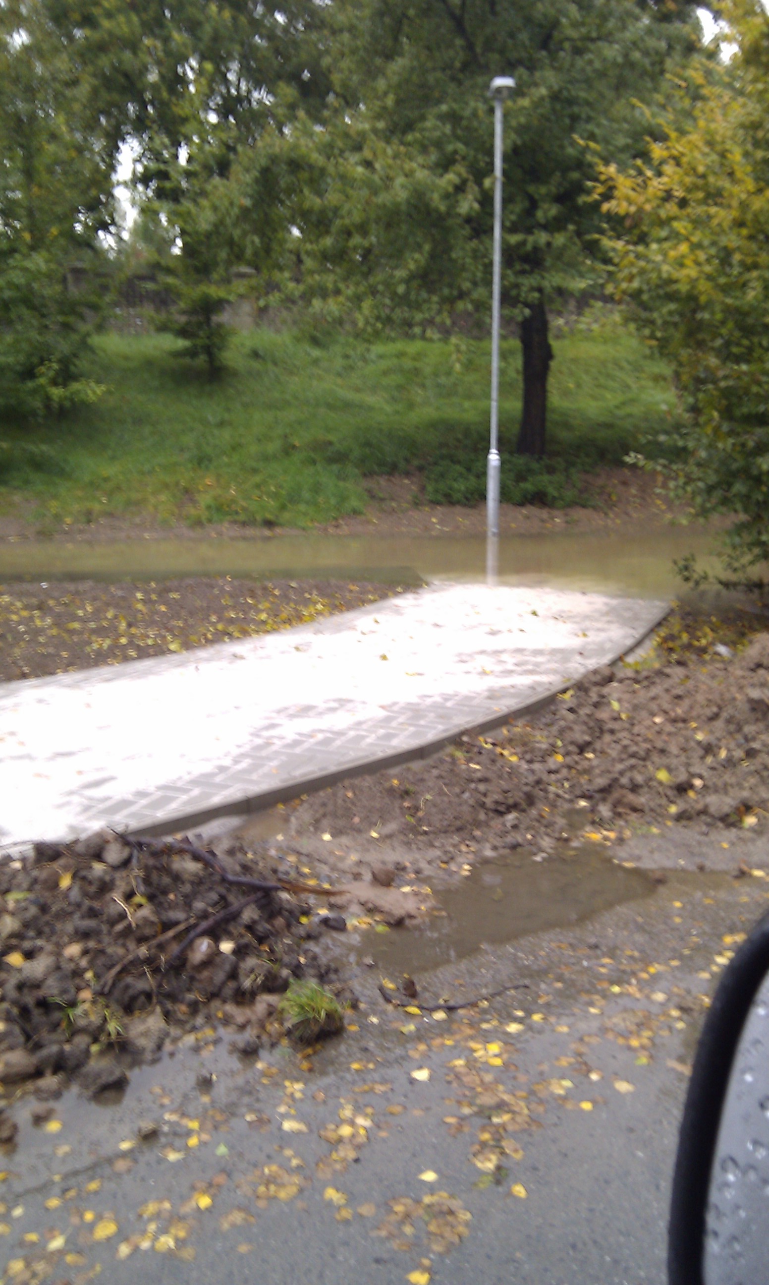 Chodník by bylo potřeba doplnit o pár uličních vpustí nebo lépe odvodňovacích žlabu napojených buď do dešťové kanalizace nebo do vsakovací jímky.